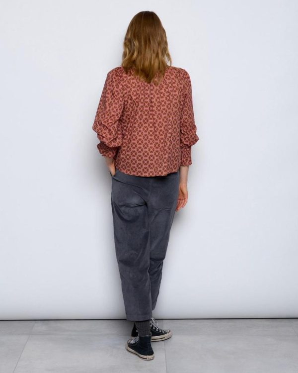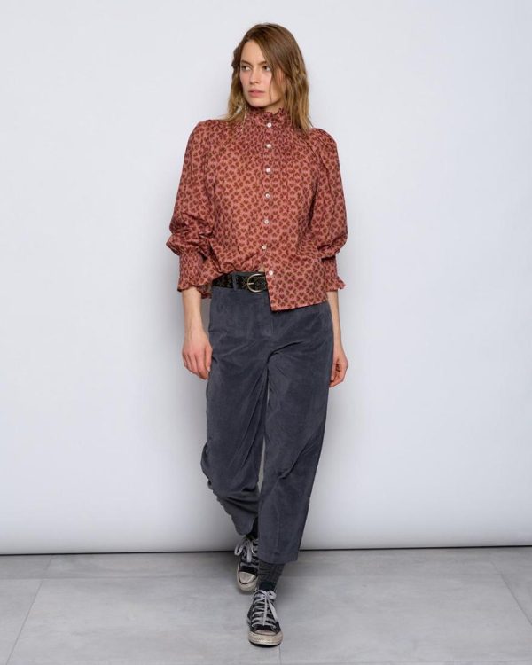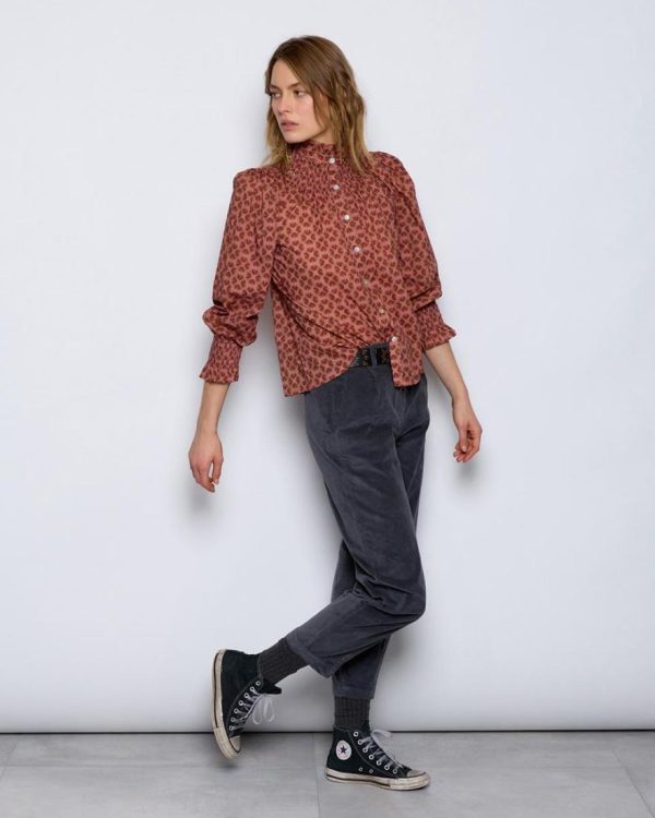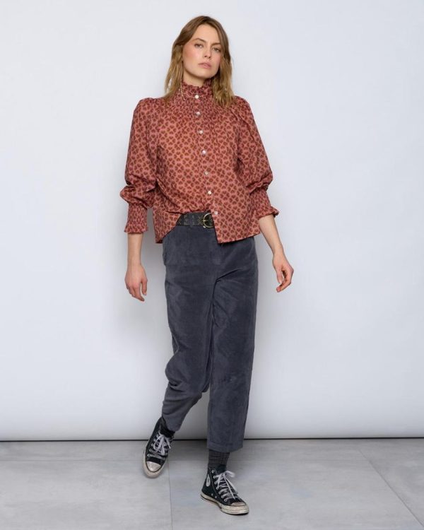 Blusa de manga larga con cuello alto de nido de abeja, gomas en puños y estampado de flores en tonos rosas, con botones en delantero.