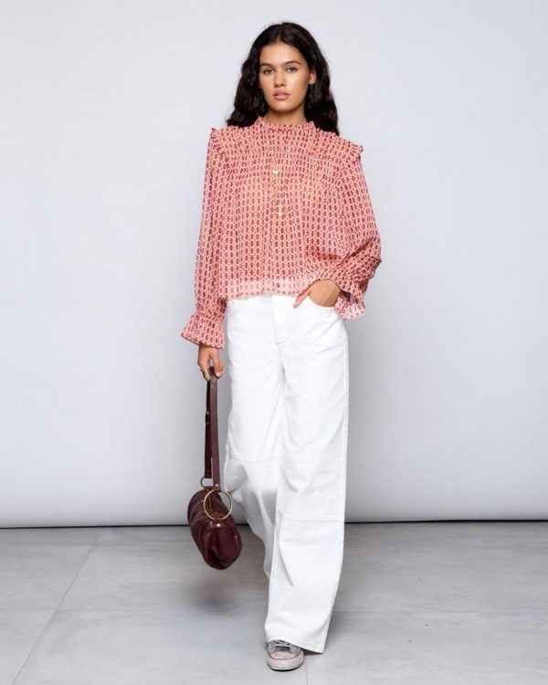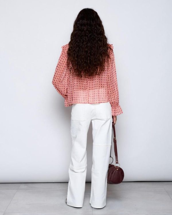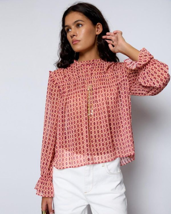 Blusa de manga larga con estampado de manchas mini en tonos rosas con detalle de goma en escote y volante en cuello.