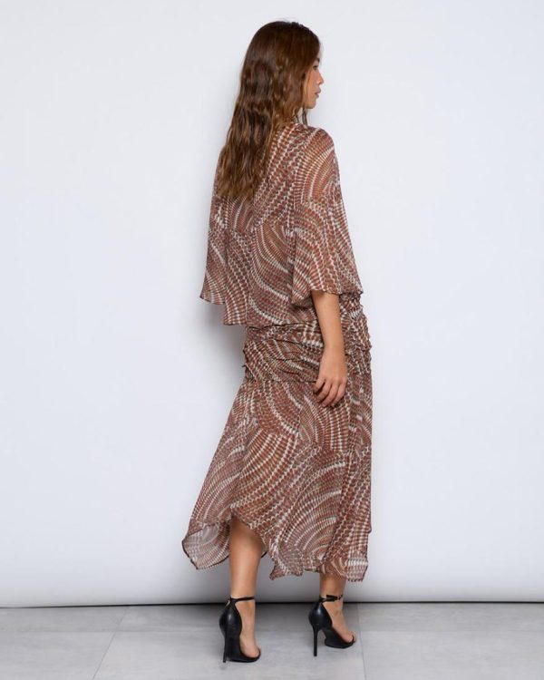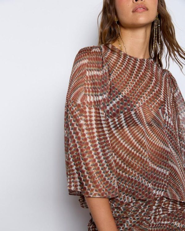 Blusa de manga larga con estampado en tonos teja. Cierre en espalda.