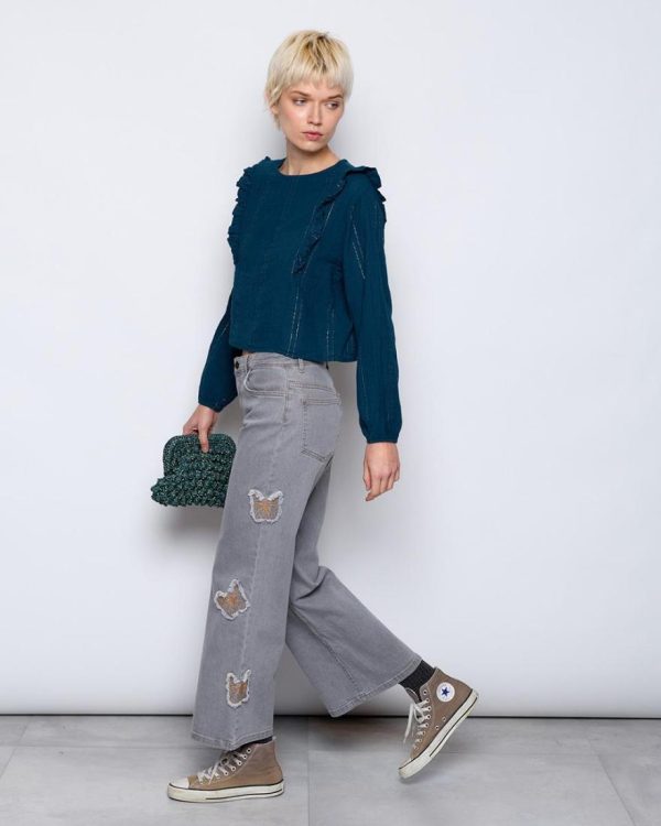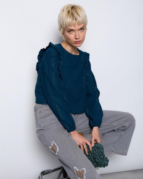 Blusa de manga larga con volantes en hombros y detalle de lúrex de color petróleo.