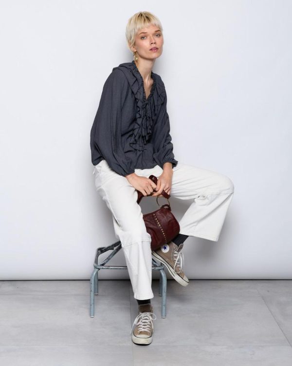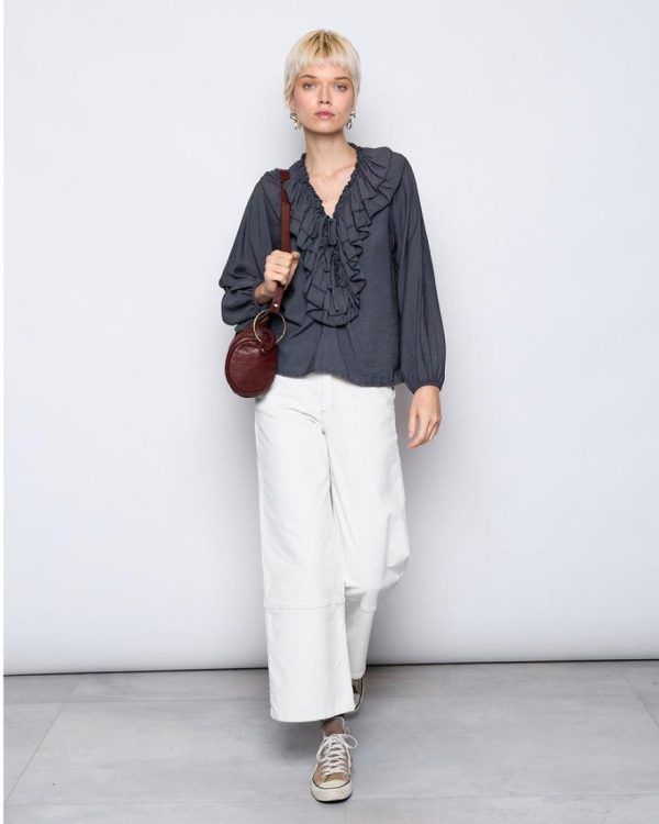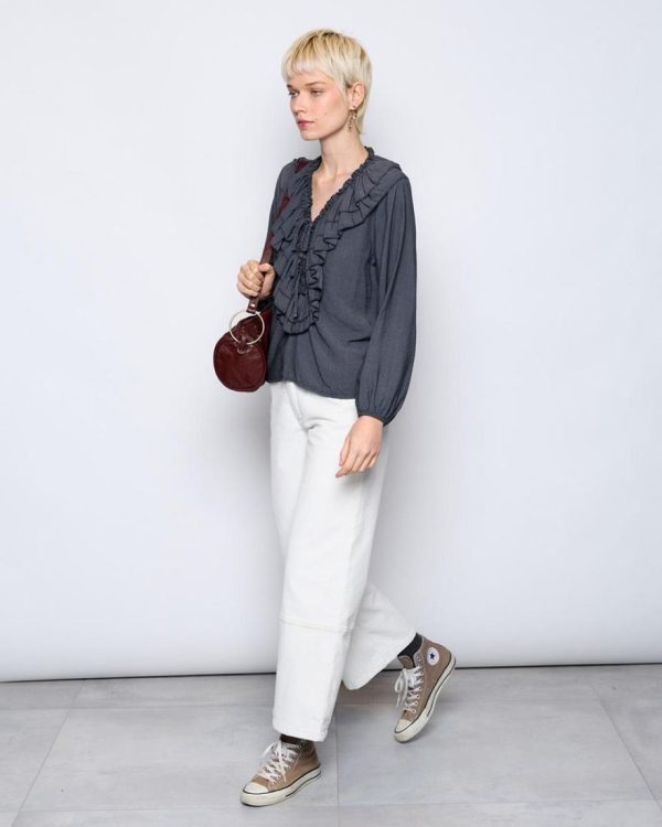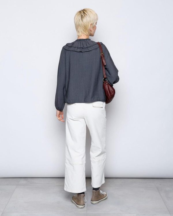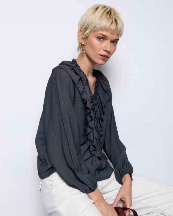 Blusa de manga larga de color gris oscuro con detalle de volante en delantero.