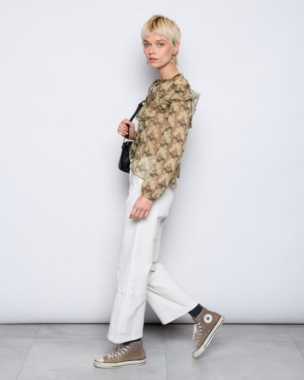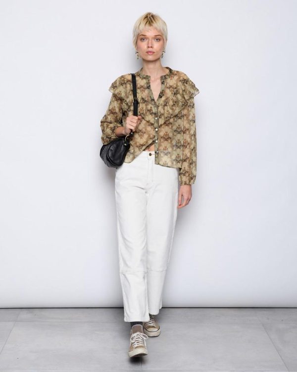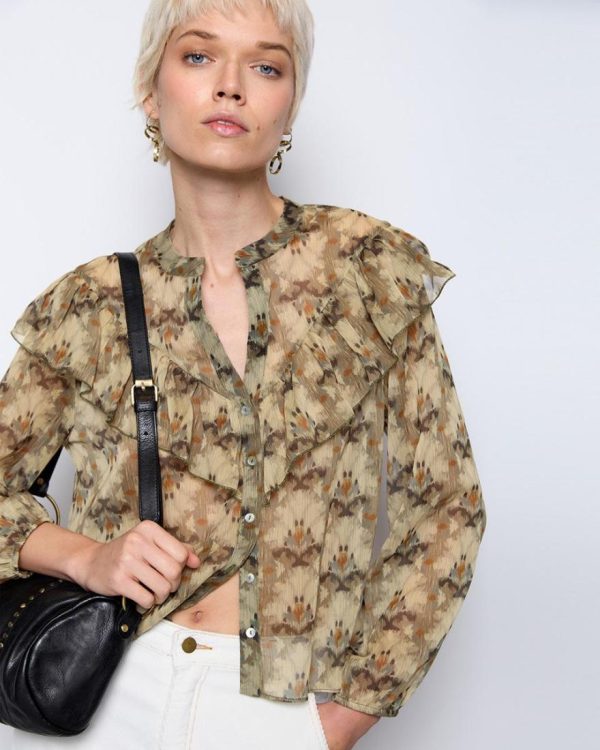 Blusa de manga larga estampada en tonos verdes, con detalle de volante pico en canesú.
