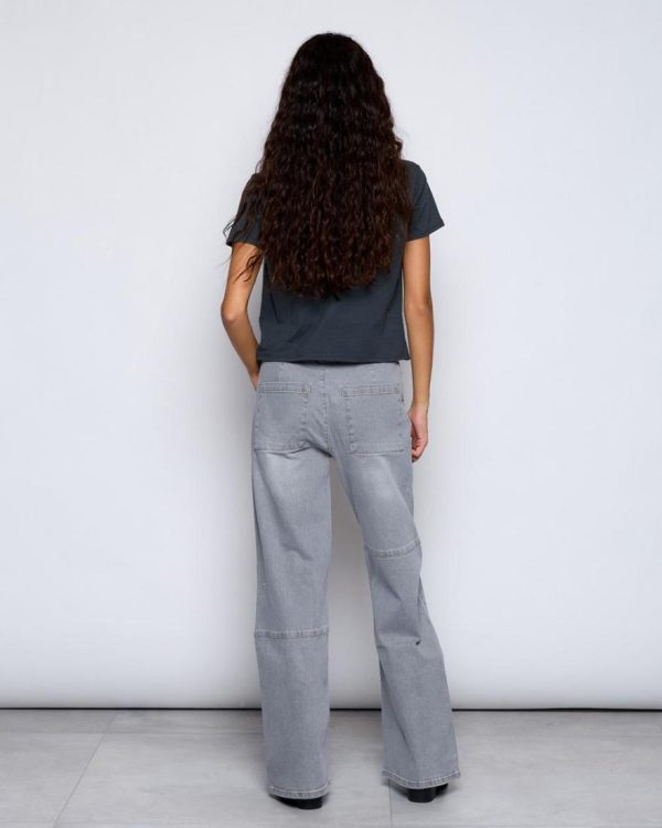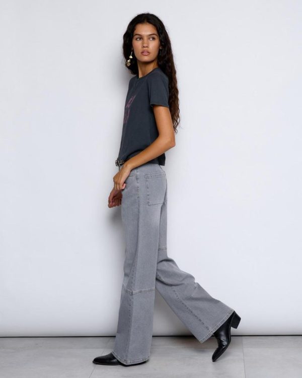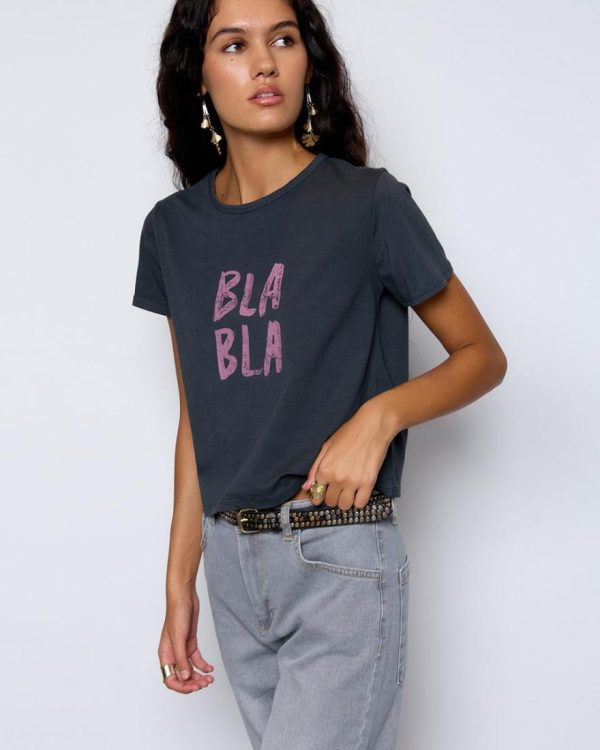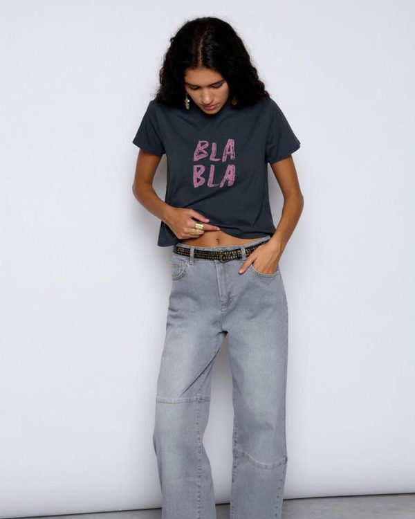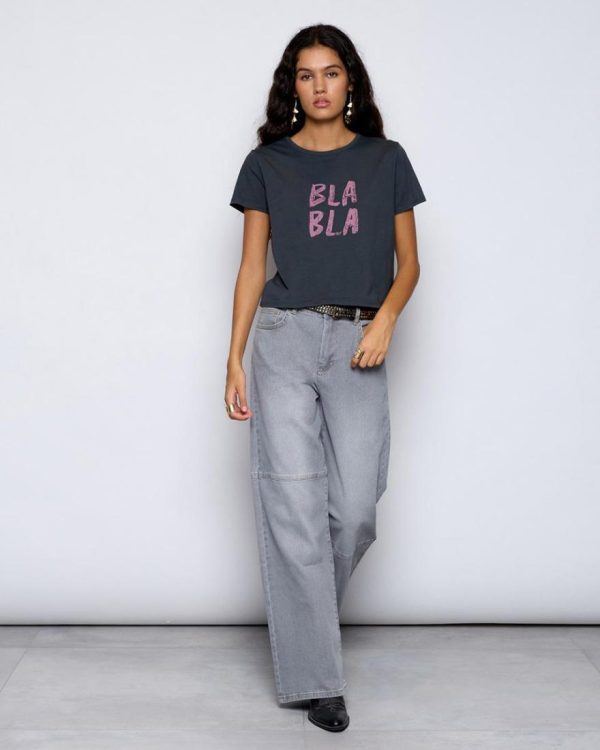 Camiseta de manga corta con letras en delantero, escote cerrado y de color gris oscuro.