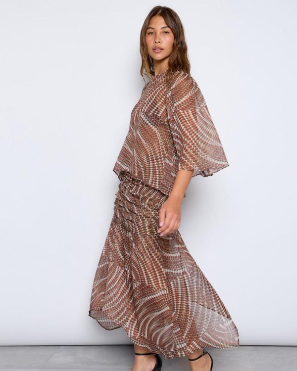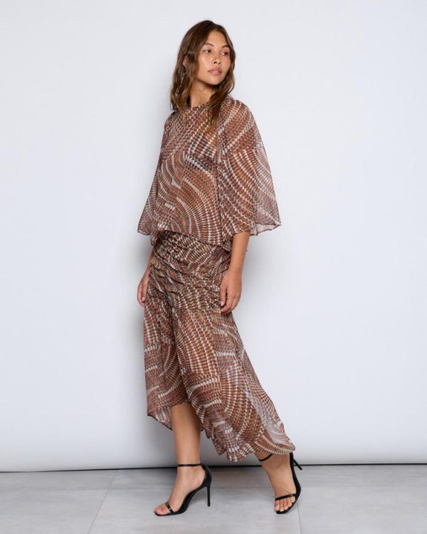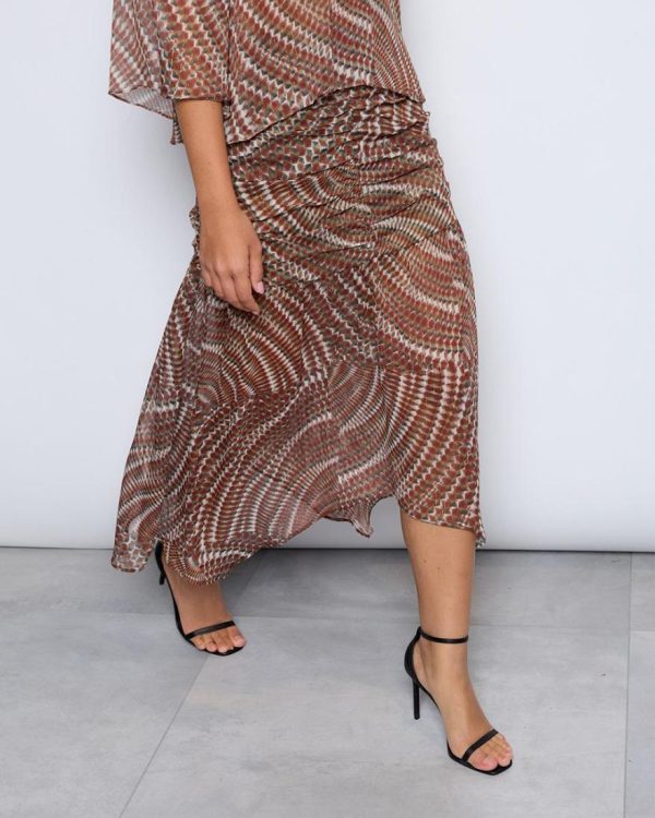 Falda larga drapeada con estampado en tonos teja y picos en lateral.