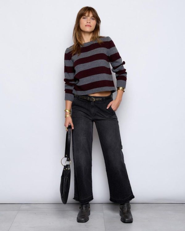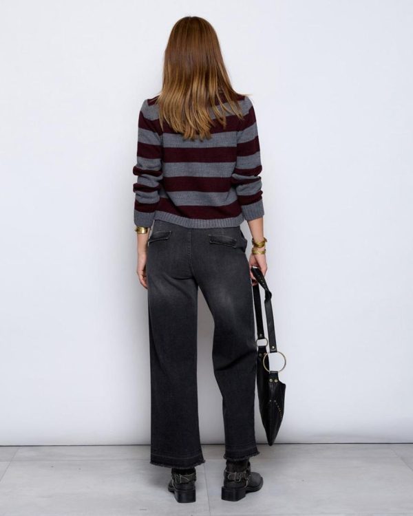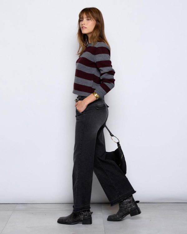 Pantalón vaquero recto campana en color gris oscuro de corte midi con cuatro bolsillos bajo con cadeneta y bolsillos traseros con tapa para mujer.