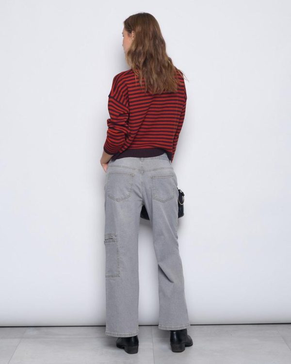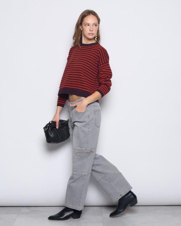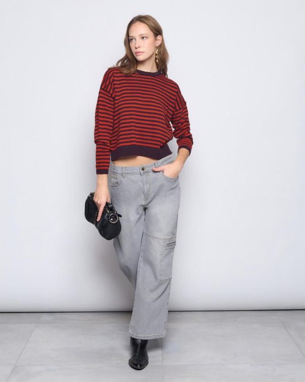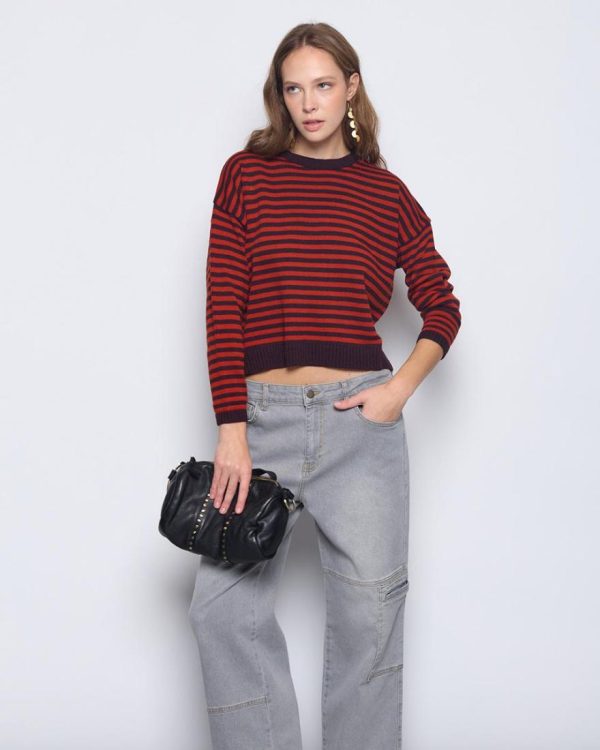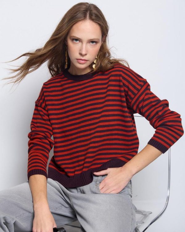 Jersey de rayas finas y cuello redondo. Rayas de color teja y burdeos.