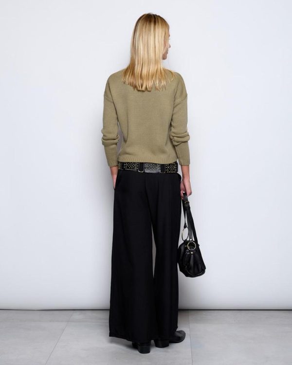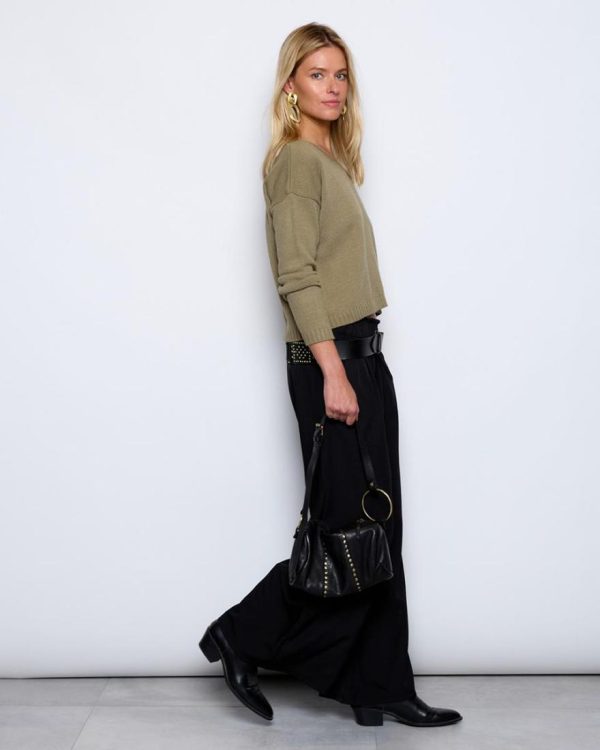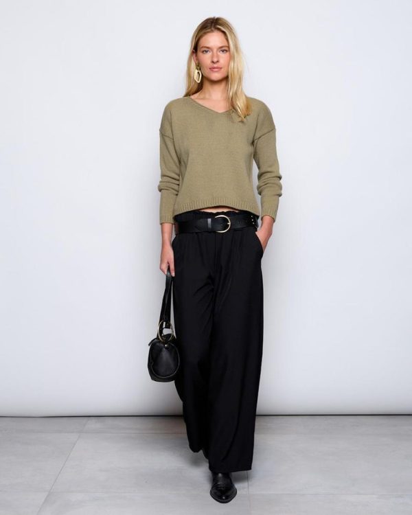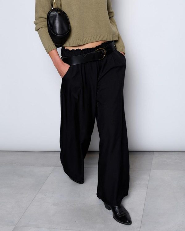 Pantalón largo fluído de color negro con detalle de goma en cinturilla.