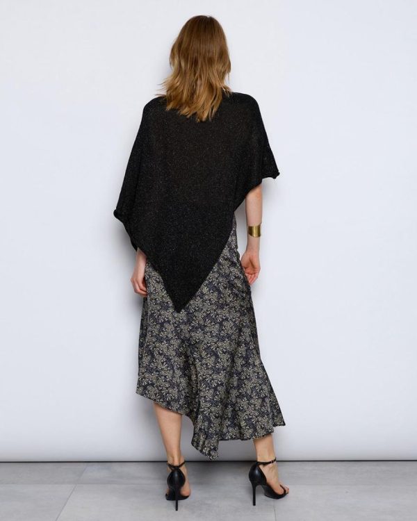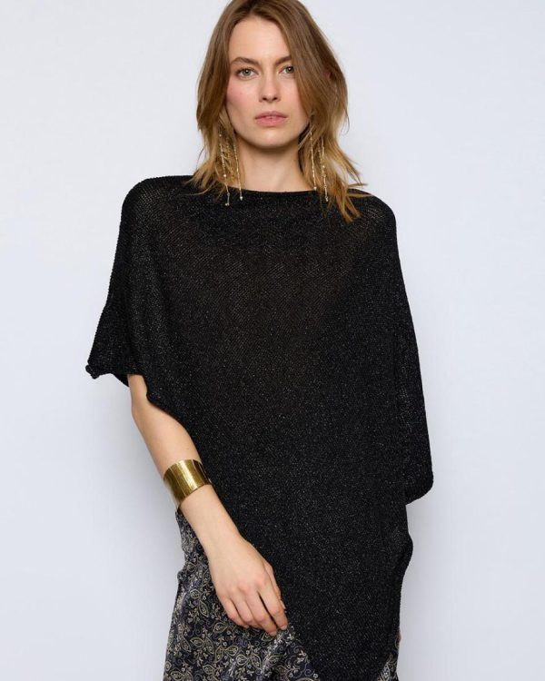 Poncho de punto de lúrex, con pico en bajo, de color negro.