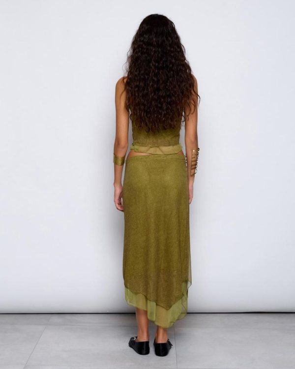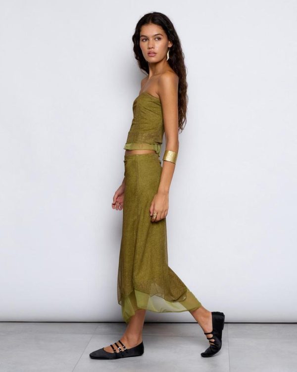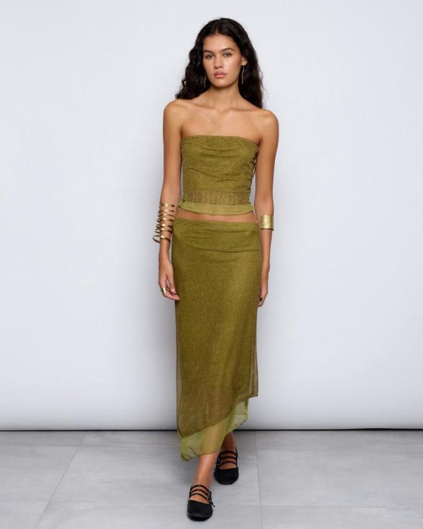 Top palabra de honor de gasa con estampado bicolor en tonos verdes, goma en escote.