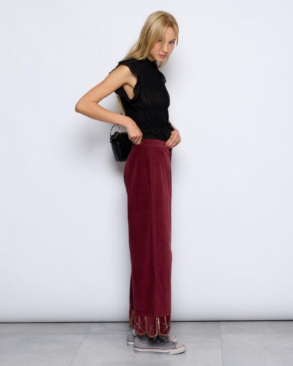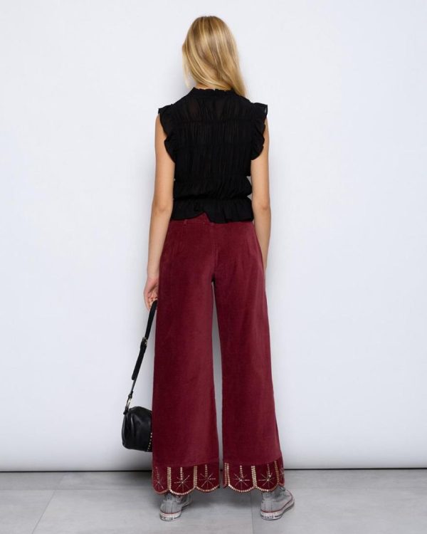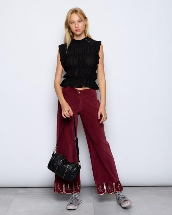 Top de gomas de color negro, con volante en cuello y manga corta.