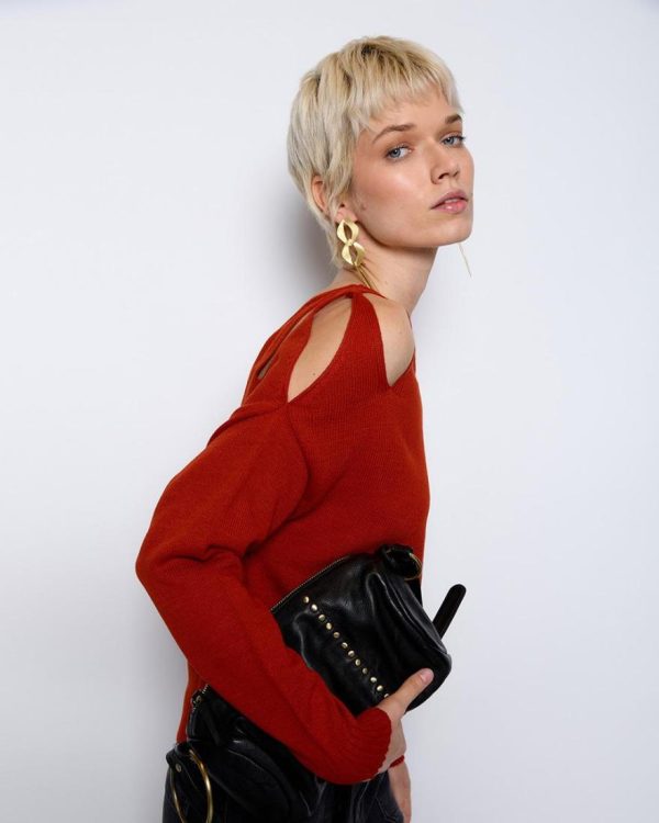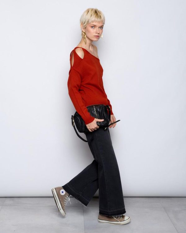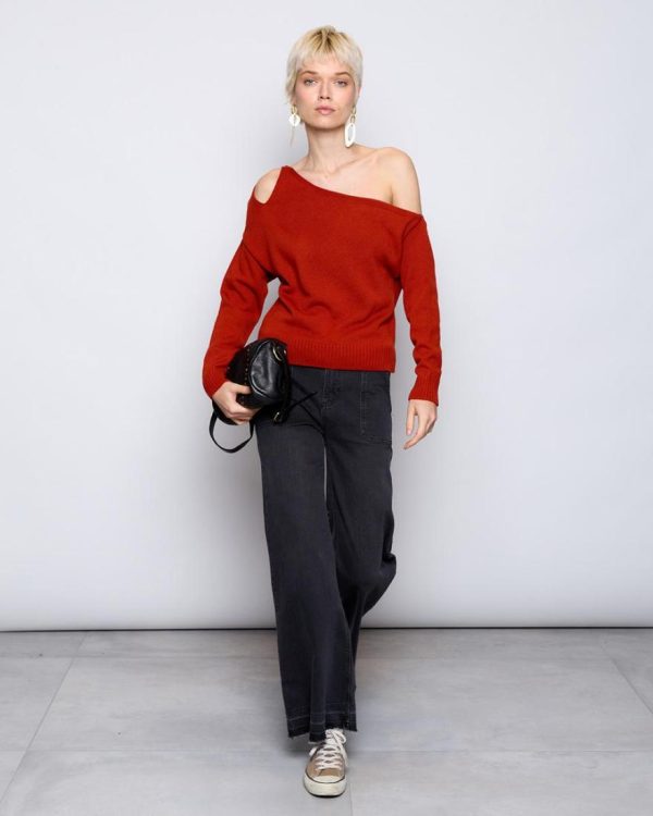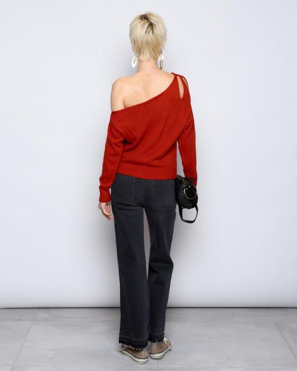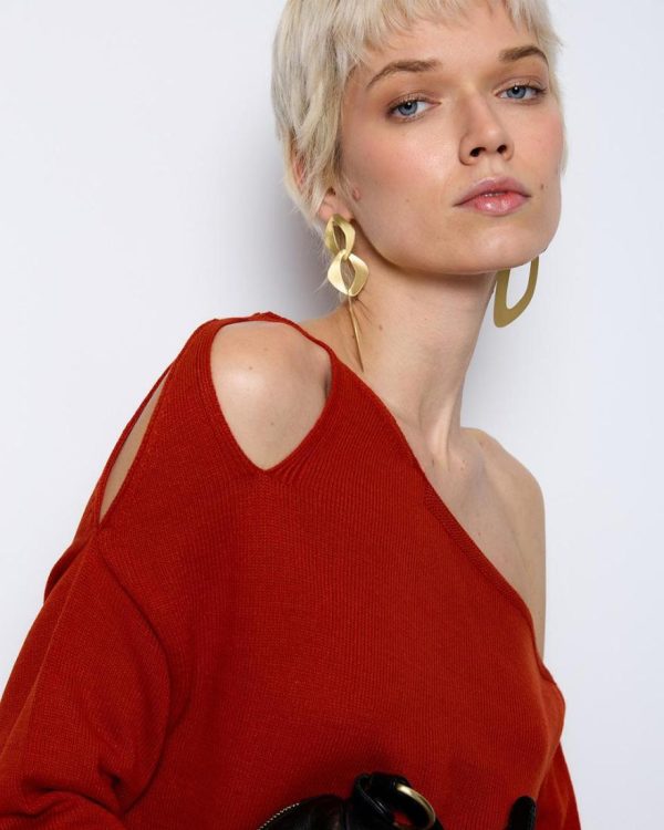 Top de punto asimétrico de color teja con detalle de abertura en hombro.