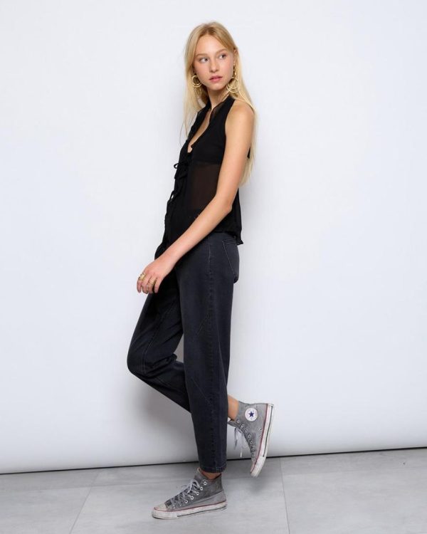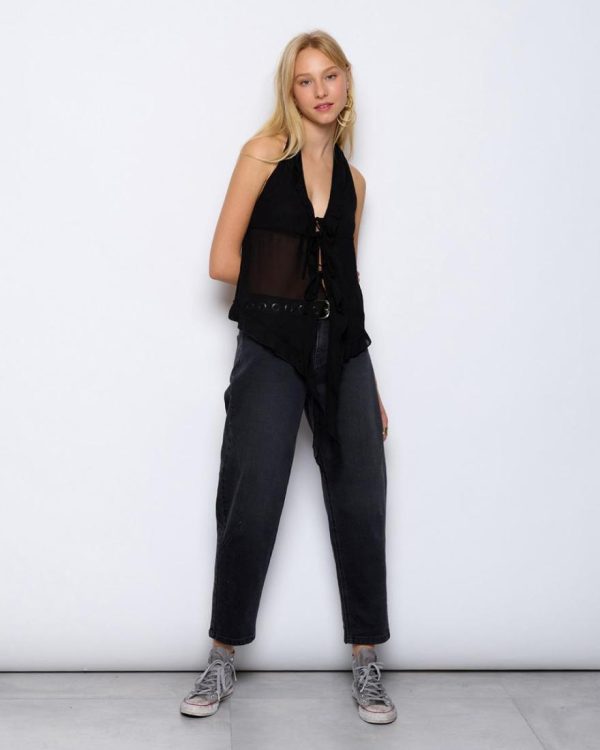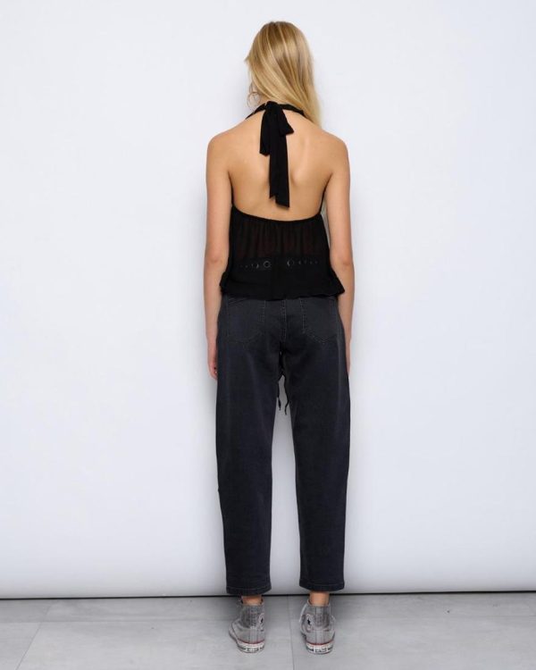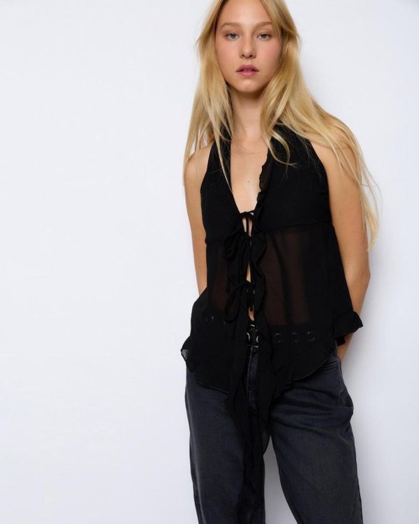 Top estilo halter de color negro, con detalle de volantes y lazada en delantero.