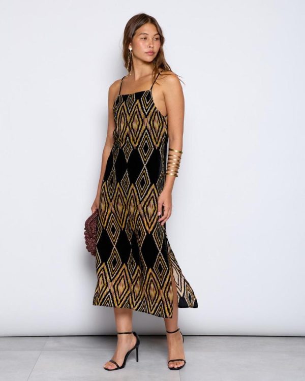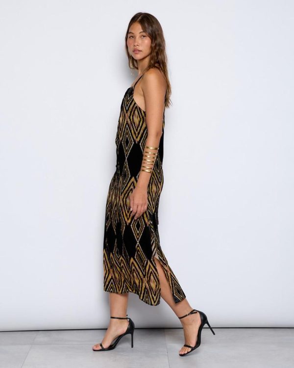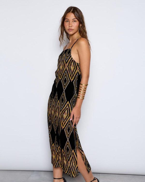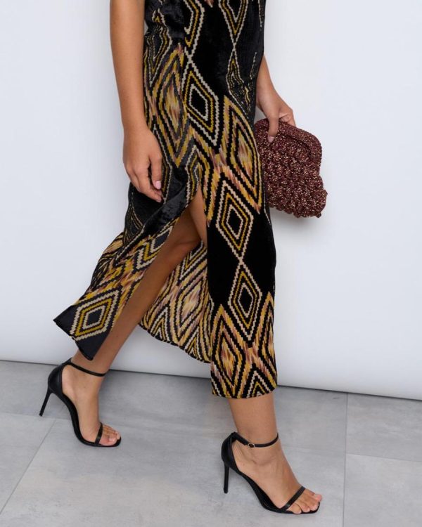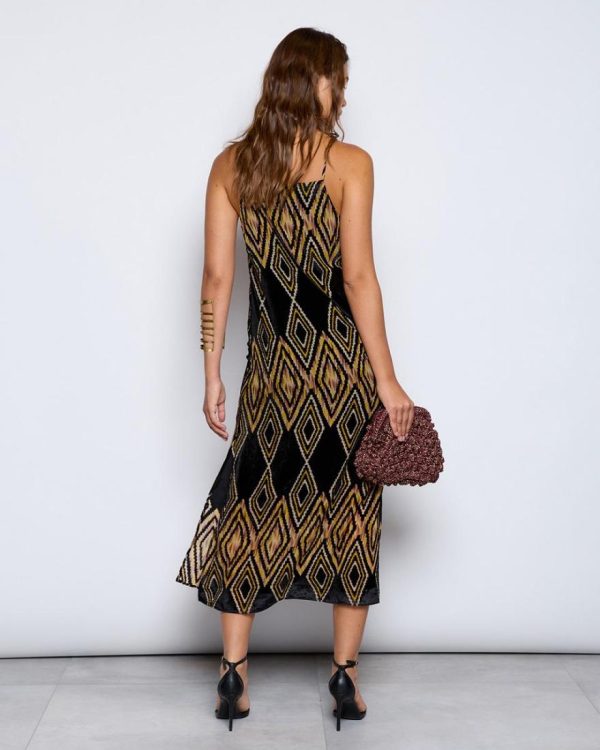 Vestido de tirantes con estampado de rombos de terciopelo. Aberturas en lateral.